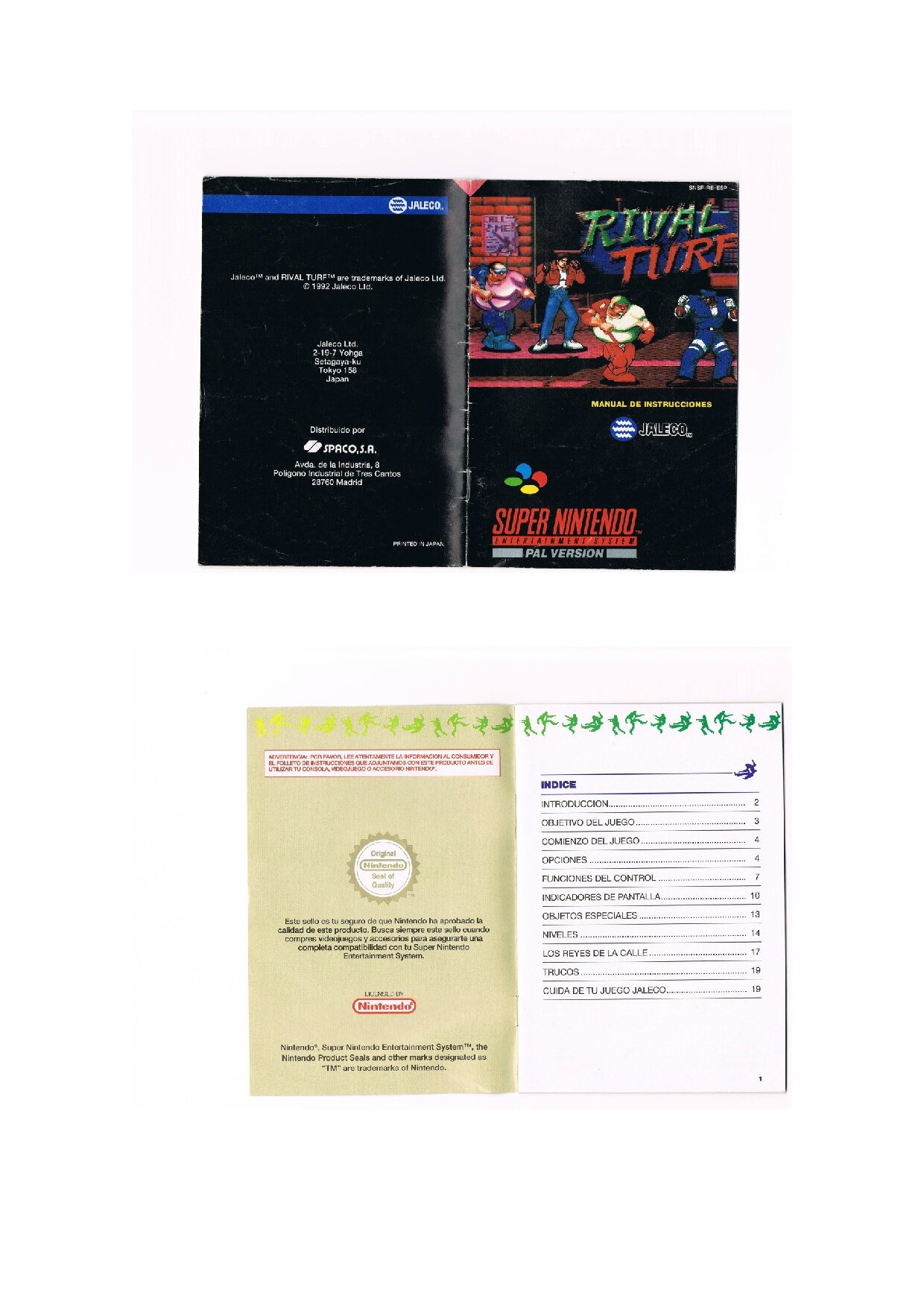 Este manual de RIVAL TURF ESP es una digitalización fiel del original físico. El documento conserva el diseño, tipografía y estructura del manual de instrucciones publicado en su momento por el fabricante para la SUPER NINTENDO.
