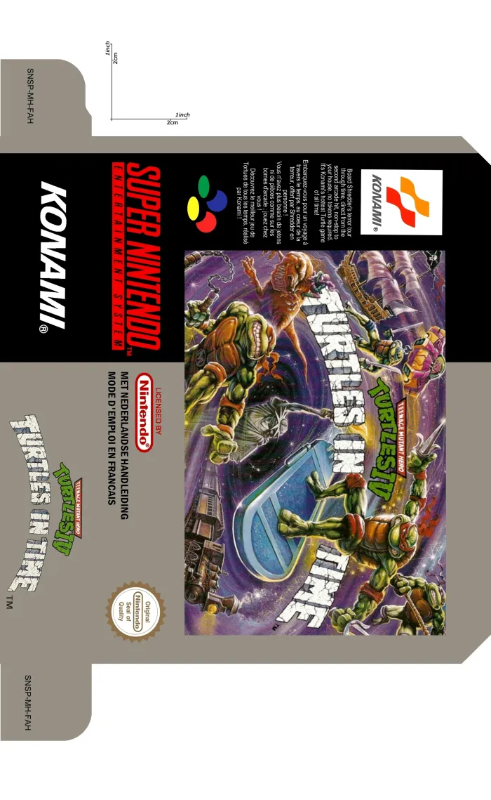 Nuestro troquel de TURTLES 4 escaneos ha sido escaneado, digitalizado y restaurado minuciosamente para eliminar roces, pegatinas o roturas. El resultado es un archivo en alta resolución (HQ) que asegura colores vivos, textos 100 % nítidos y las dimensiones milimétricas originales de SUPER NINTENDO para que encaje a la perfección.
