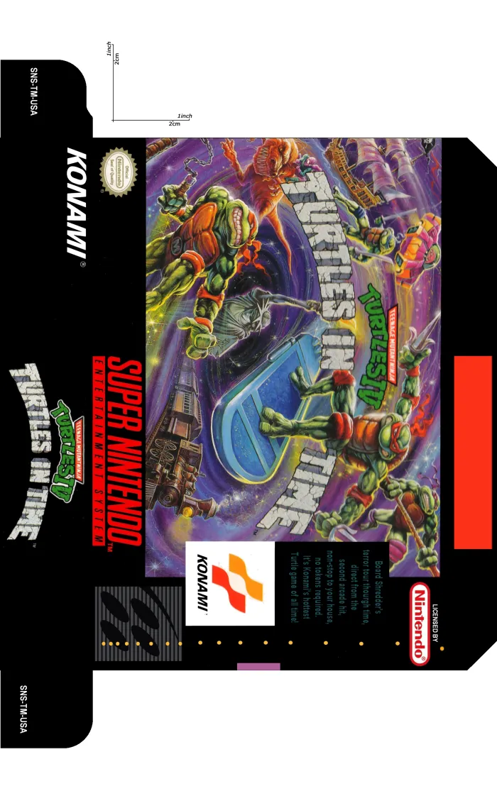 Consejo de impresión: Imprime esta caja repro de TURTLES 4 IN TIME USA escaneos en cartulina o papel estucado mate (entre 300 g y 350 g). Solo tendrás que recortar por el contorno del troquel, marcar los pliegues y pegar la solapa lateral. Obtendrás una funda protectora impecable para tu juego retro.